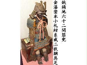 鉄錆地六十二間筋兜金漆塗本小札紺糸威二枚胴具足