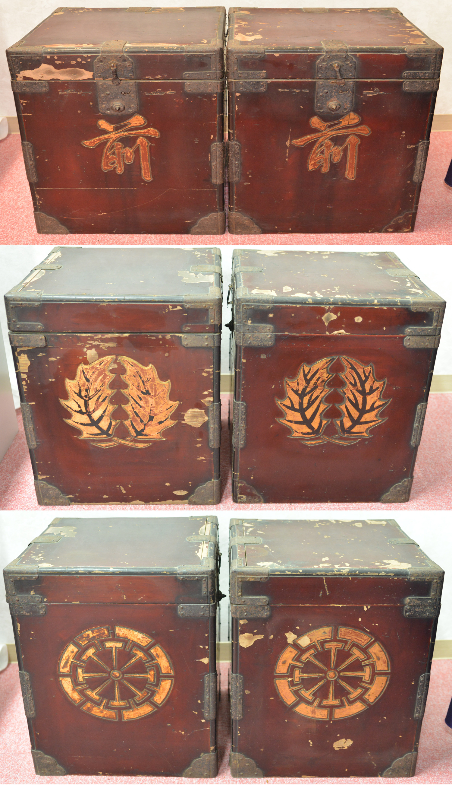 ご覧頂き誠にありがとうございます。私見ですがこの鎧は、江戸時代初期、約350年位前の時代はあるのではないかと思います。鎧には源氏車の家紋をあしらい、これは徳川時代には大名の榊原氏、生駒氏ほか幕臣では三十余家が用いていたとあります。鎧櫃は二つに分かれ、源氏車と柊の紋が入り、柊は大関、市橋氏大名ほか六十七家の幕臣が使用していたようで、まさに大名道具であります。鎧はほぼ完品と思われますが、全体的に時代の傷みが見られ、特に兜や布、糸の部分に傷みが見られます。しかしながら六十二間筋兜、面頬は見事なもので、これだけでも相当な価値があると思われます。鎧の知識のある方に補修、修復して頂き末永くご愛蔵頂ければと思います。入札の程宜しくお願い申し上げます。尚、申し訳ありませんが、落札手数料2.625%の御負担お願い致します。