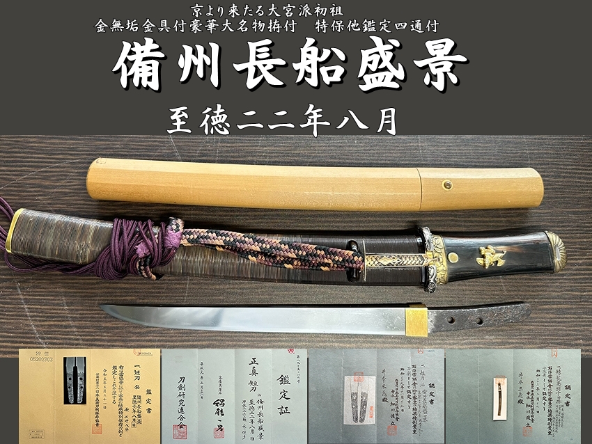 ⭐️京より来たる大宮派初祖 備州長船盛景 至徳ニニ年八月 七寸八分 金無垢金具付豪華大名物拵付 特保他鑑定四通付⭐️