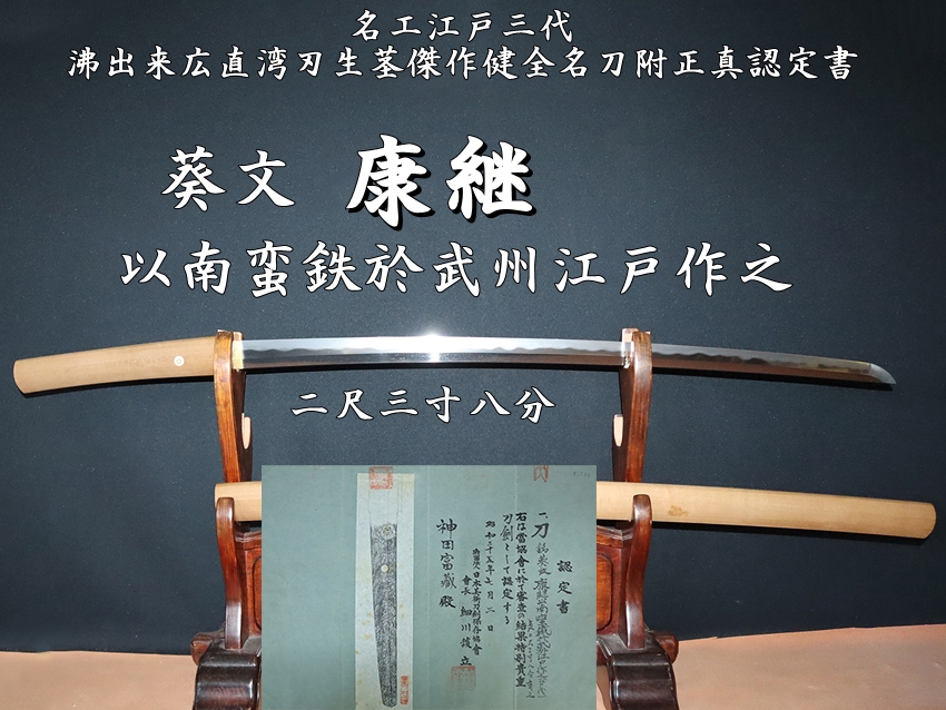 ⭐️名工江戸三代 葵文康継以南蛮鉄於武州江戸作之 二尺三寸八分 沸出来広直湾刃生茎傑作健全名刀附正真認定書 保証品