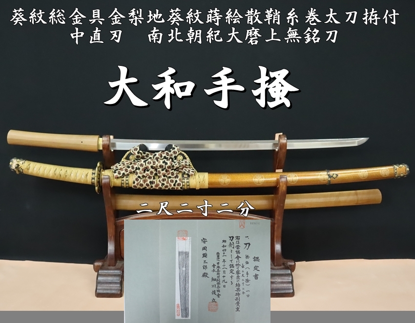 ⭐️大和手掻 葵紋総金具金梨地葵紋蒔絵散鞘糸巻太刀拵付 二尺二寸二分 中直刃 南北朝紀大磨上無銘刀⭐️