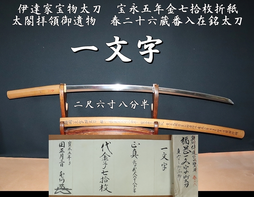 《伊達家宝物太刀 一文字 二尺六寸八分半 宝永五年金七拾枚折紙 太閤拝領御遺物 春二十六蔵番入在銘太刀》