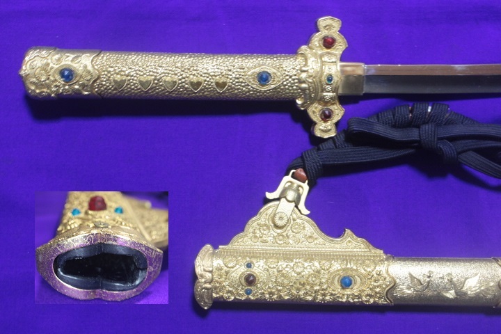 国宝梨地螺鈿金装餝剣 平安時代 国立博物館所蔵 複製 金属製 総重量2.9kg 模造刀 剣掛け台付 ★中古品