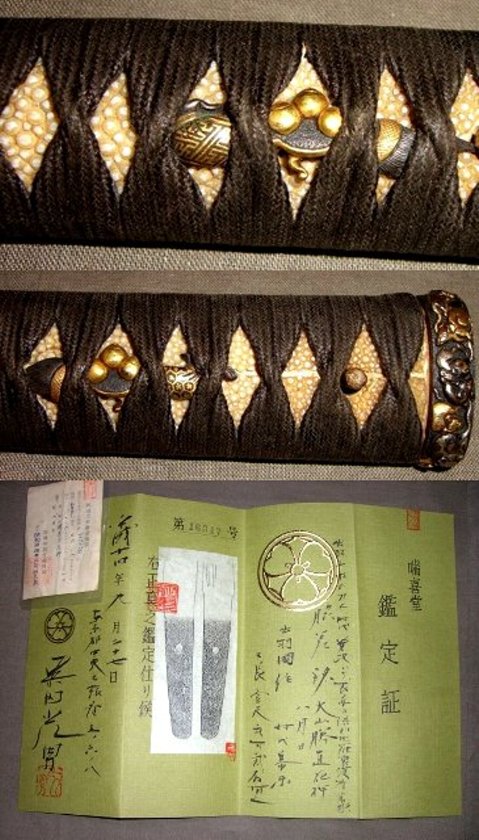 画像3-柄の拡大画像 目貫は宝珠と巾着 親鮫を利用してあります 刀剣柴田の鑑定書(私が申請して取りました)