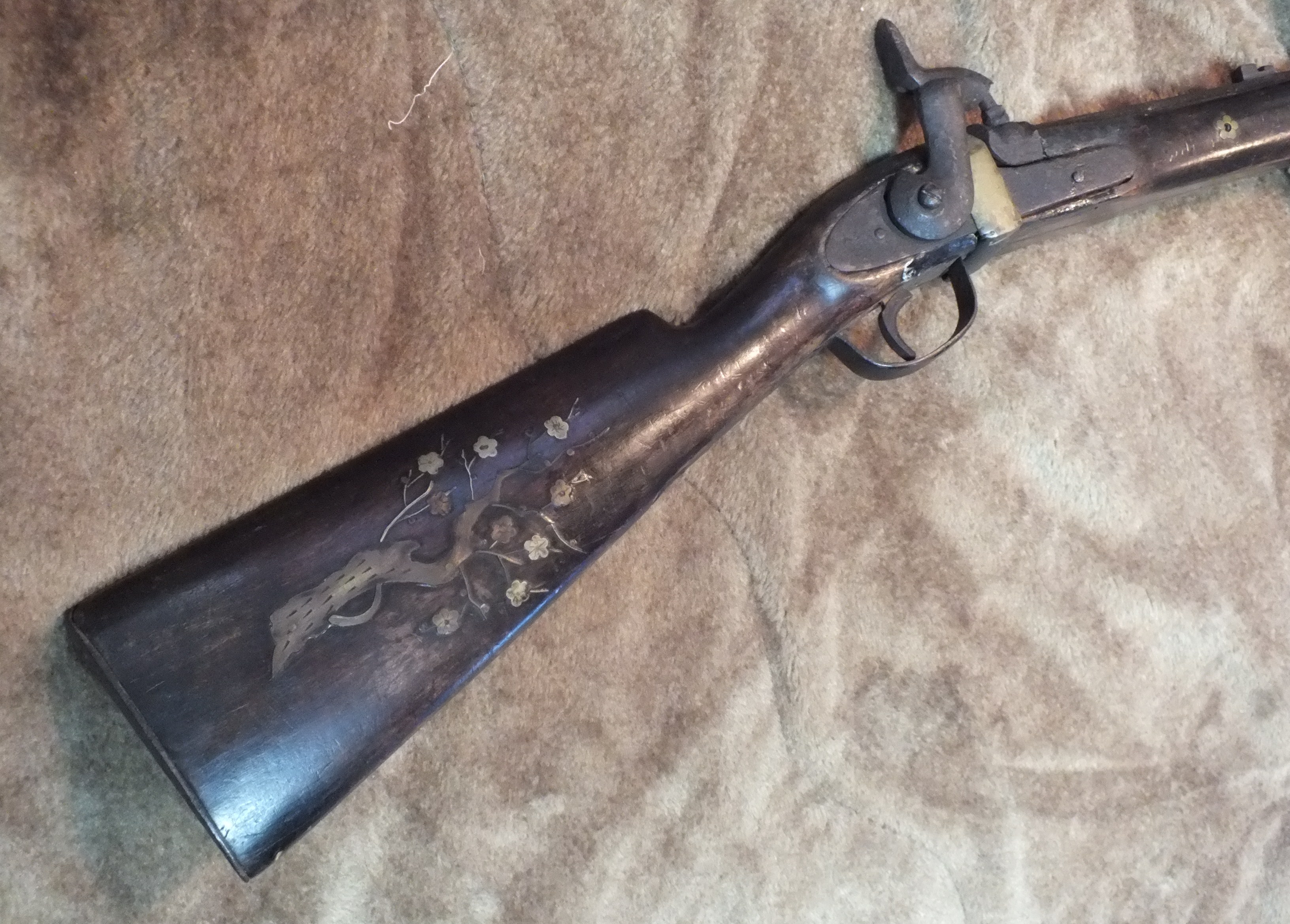 ★(値下げしました)★テレビドラマ『八重の桜』でお馴染みの“合法処理済み”の“管打ち銃(無可動本物)”です。写真でも判るように、時代の傷みと補修痕が有りますが肩当部分に梅の木(?)模様入りの高級品です。きっと名のある武将の持ち物だったことが伺える品です。合法処理してあり機能はしませんので、モデルガンのように壁に掛けて装飾としてのみ御使用ください。