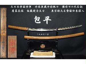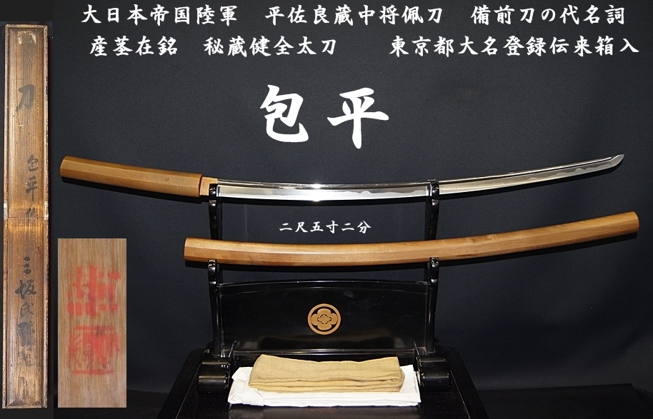 ☆大日本帝国陸軍 平佐良蔵中将佩刀 備前刀の代名詞☆◎包平◎☆産茎在銘 秘蔵健全太刀 二尺五寸二分 東京都大名登録伝来箱入☆