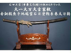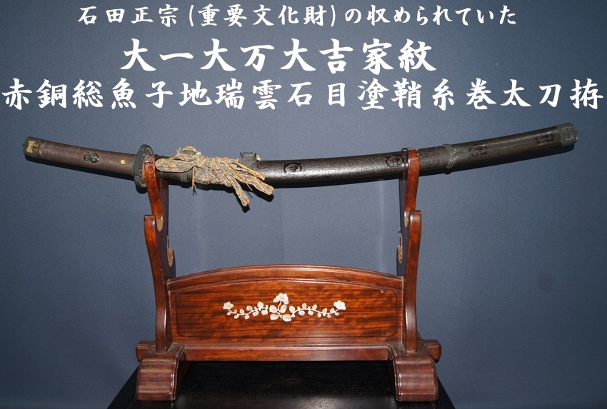 ☆石田正宗(重要文化財)の収められていた大一大万大吉家紋赤銅総魚子地瑞雲石目塗鞘糸巻太刀拵☆【委託販売承中】
