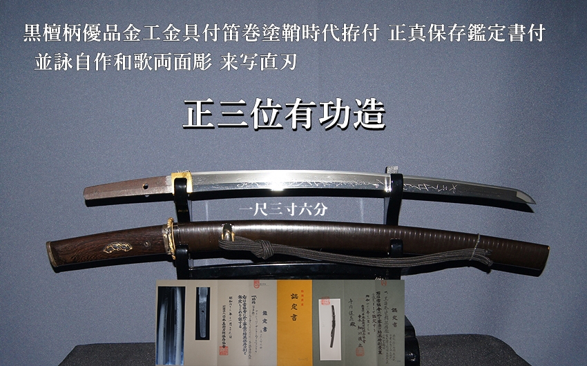 《正三位有功造 並詠自作和歌両面彫 一尺三寸六分 来写直刃 黒檀柄優品金工金具付笛巻塗鞘時代拵付 正真保存鑑定書付》