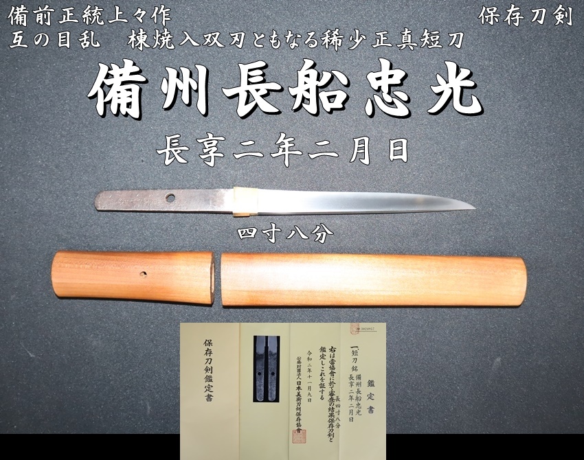 ◇備前正統上々作 備州長船忠光 長享二年二月日 四寸八分 互の目乱 棟焼入双刃ともなる稀少正真短刀 保存刀剣◇