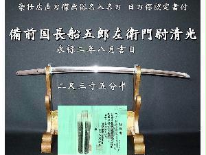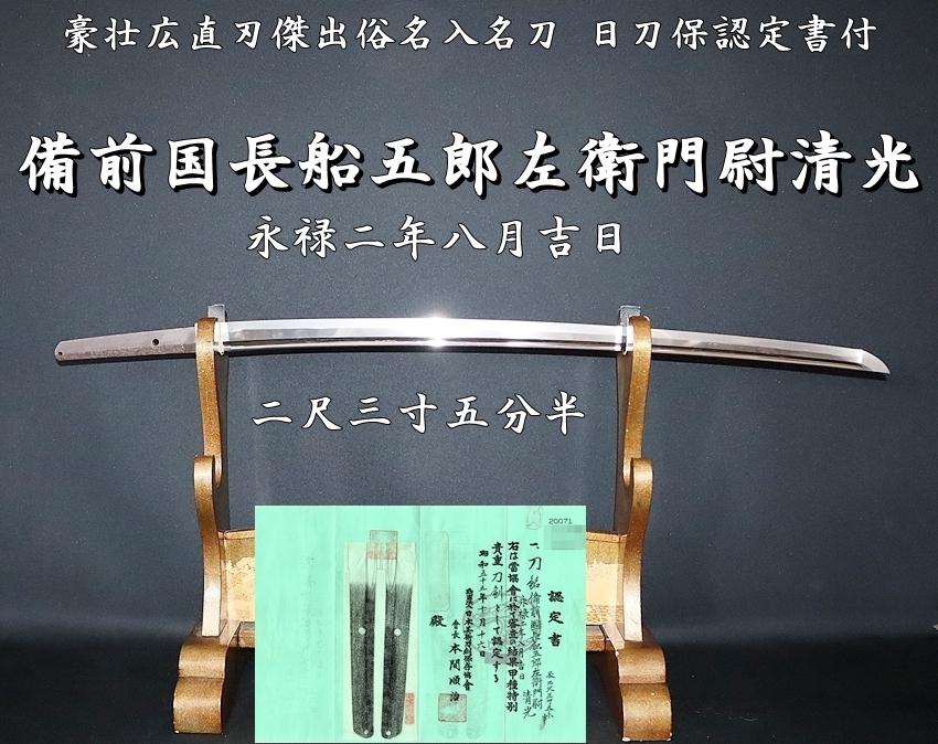 ⭐️備前国長船五郎左衛門尉清光 永禄二年八月吉日 二尺三寸五分半 豪壮広直刃傑出俗名入名刀☆認定書付⭐️