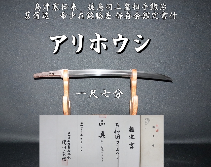 ⭐島津家伝来 後鳥羽上皇相手鍛治「アリホウシ」 一尺七分 菖蒲造 希少在銘脇差⭐保存会鑑定書付⭐