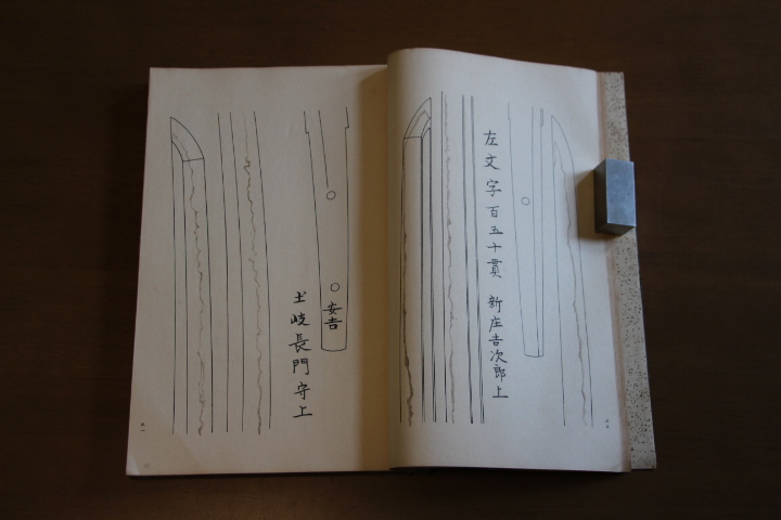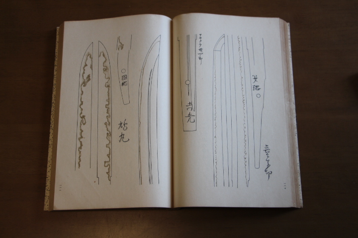 | この本は江戸の近江守継平-二代が徳川将軍家の蔵刀を描いた刀絵図。初め蔵刀拝見を許され、さらに押形取りを願い出たところ、それも許可されたので、十巻の巻物にして二部作り、一部を八代将軍吉宗に献上したところ、享保2年、褒美として地服三枚を下賜された。 名物そのほか89振りの中心と刃文を写したほか、寸尺・折紙枚数・献上者などが注記されている。古押形の中では、刃文の描写は比較的に精密となっている | |||