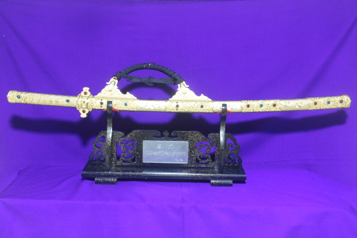 国宝梨地螺鈿金装餝剣 平安時代 国立博物館所蔵 複製 金属製 総重量2.9kg 模造刀 剣掛け台付 ★中古品