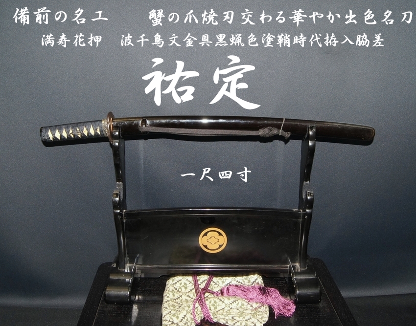 ☆備前の名工☆祐定☆一尺四寸☆蟹の爪焼刃交わる華やか出色名刀☆満寿花押 波千鳥文金具黒蝋色塗鞘時代拵入脇差☆【委託販売承中】