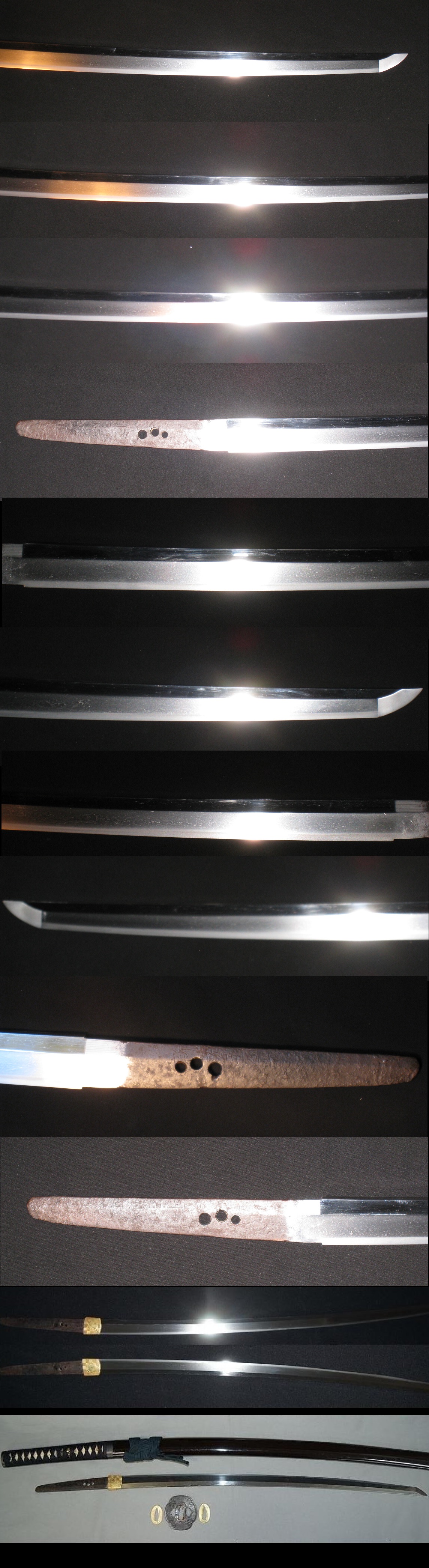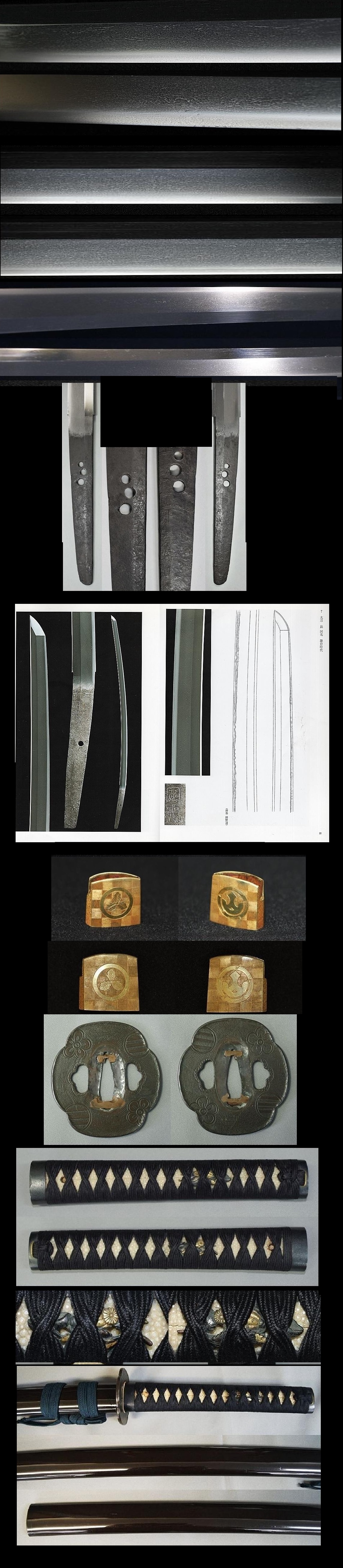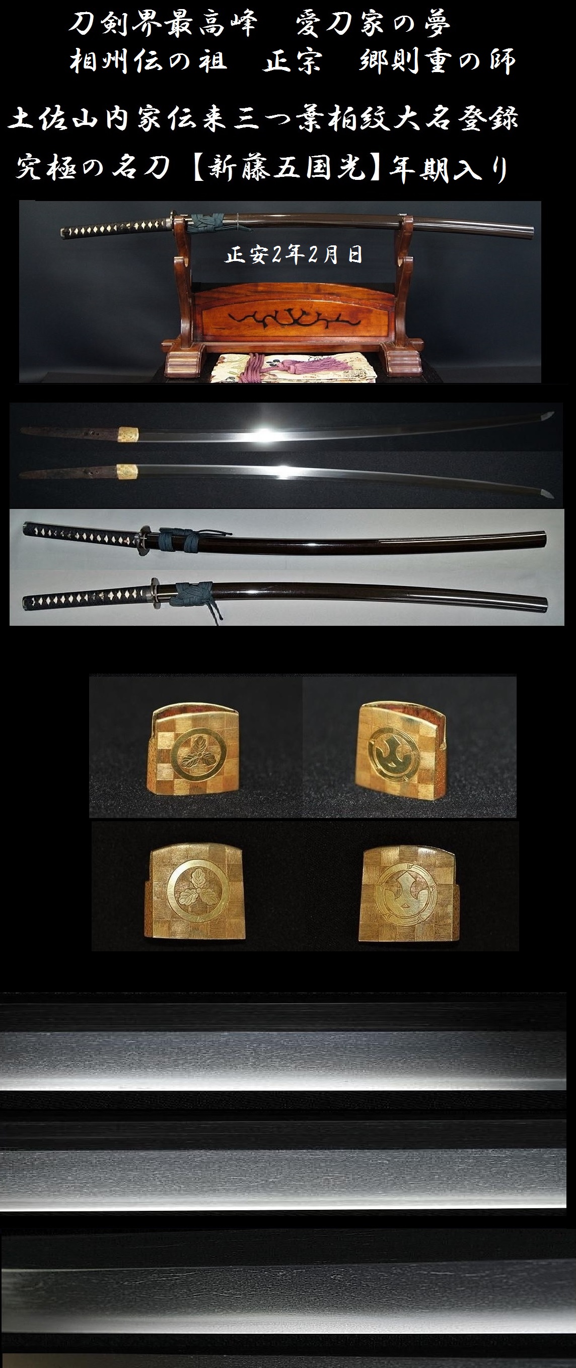 本刀は土佐山内家伝来の【新藤五国光】です。最上研磨済みで、拵えも特別保存刀装具の可能性も十分な拵えです。鹿児島県654号まさに大名登録。又ハバキは表に丸に山、家紋(山内家家紋)、裏に土佐柏、鍔は室町期の古金工「花に丸に三つ引」が施されています。山内家伝来はほぼ間違いないでしょう。【新藤五国光】は、鎌倉時代後期の相模国の刀工です。永仁元年(1293年)から正中(1324年)までの在銘作刀がある法師鍛冶で[1]、相州伝の実質的創始者である。新藤五国光は相州鍛冶の祖として、相州伝という新作風を樹立したばかりでなく、行光・正宗・則重等の名工を育成した鎌倉時代屈指の巨匠である。彼の作風は一見粟田口風であるが、地景・金筋など地刃の働きが一段と目立っている処に特色がある。国光の作刀で年紀のあるものは永仁元年より元亨四年までの四十二年間に亘っており、古来より短刀の名手と賞賛される通り、国宝・重要文化財など幾多の名作を伝えている。本作は「特別展正宗―日本刀の天才とその系譜」に図譜で御紹介された、新藤五國光の細やかな美しい地景が現れた極美地鉄と、明るく冴え渡る小錵出来の直刃の作域が見事に合致する刀身の出来栄えとなっており、刃中に細やかな金筋二重刃喰違刃が随所に現れる様までが見事に等しく現れています。山内家(初代山内一豊公)家紋入りの極上なる意匠の良い金着時代鎺と、鍔は室町期の古金工「花に丸に三つ引」家紋が現された木瓜鍔の稀少品が付属しており、この時代の作は単品に於いても特別保存刀装具以上に指定されるものとなっています。柄前の縁頭は手置きの良い黒々とした赤銅石地文縁頭であり、目貫は後藤花文目貫で、金着切羽も傷みなく、黒蝋色塗時代鞘も若干の小当たりのみで漆剥げの箇所は無く、概ね保存状態の良い大名物時代拵となっています。是非家宝の一振りに加えて下さい。大名跡の為鑑定には一切出していないとの事。変に鑑定に出して妙な結果になるとこのお刀の価値が下がるため今まで一切の鑑定に出していないとの事。この刀があれば鑑定書は不要と思われる程の大名跡【新藤五国光】です。依頼品のためキャンセルはご遠慮ください。古美術品の為個人の感覚に相違がありますので写真をよく見て頂きますようお願いします。質問は仕事の関係ですぐにお答えできない場合がありますので、私のアドレス若しくは携帯までお願いします。わかる範囲で誠意をもってお答えいたします。 bkdat805@rinku.zaq.ne.jp 090-5884-0695 以上よろしくお願いします。評価0叉はマイナスの方は質問欄より入札のご相談をお願いします。相談のない場合は削除させて頂く場合がありますのでご了承ください。(刀身重量):約513グラム【寸法】 元幅:約2.77cm 元重:約6.5mm 先幅:約1.7cm 先重:約4.3mm