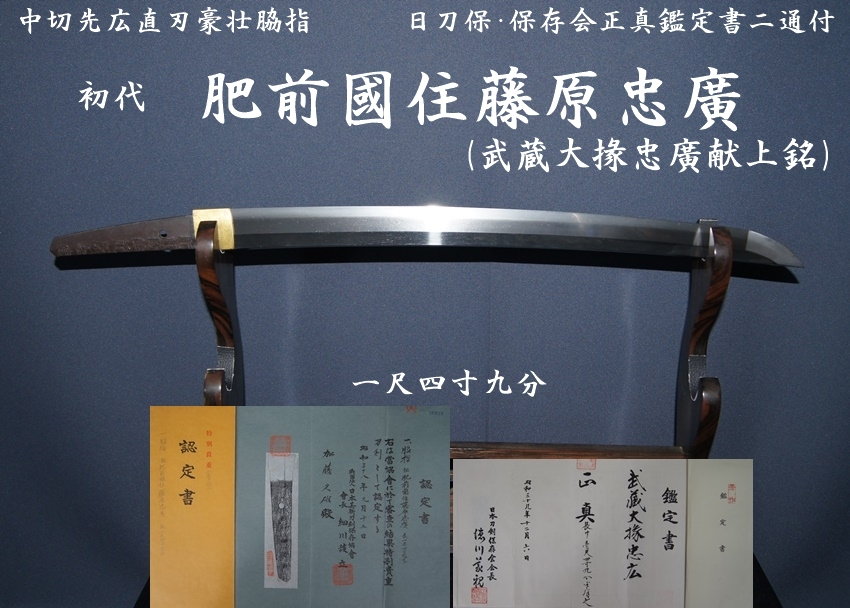 <初代 肥前國住藤原忠廣(献上銘) 一尺四寸九分 中切先広直刃豪壮脇指 日刀保・保存会正真鑑定書二通付>