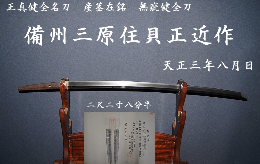 本作は備州三原住貝正近作・天正三年八月日の産茎在銘無疵健全刀となっています。